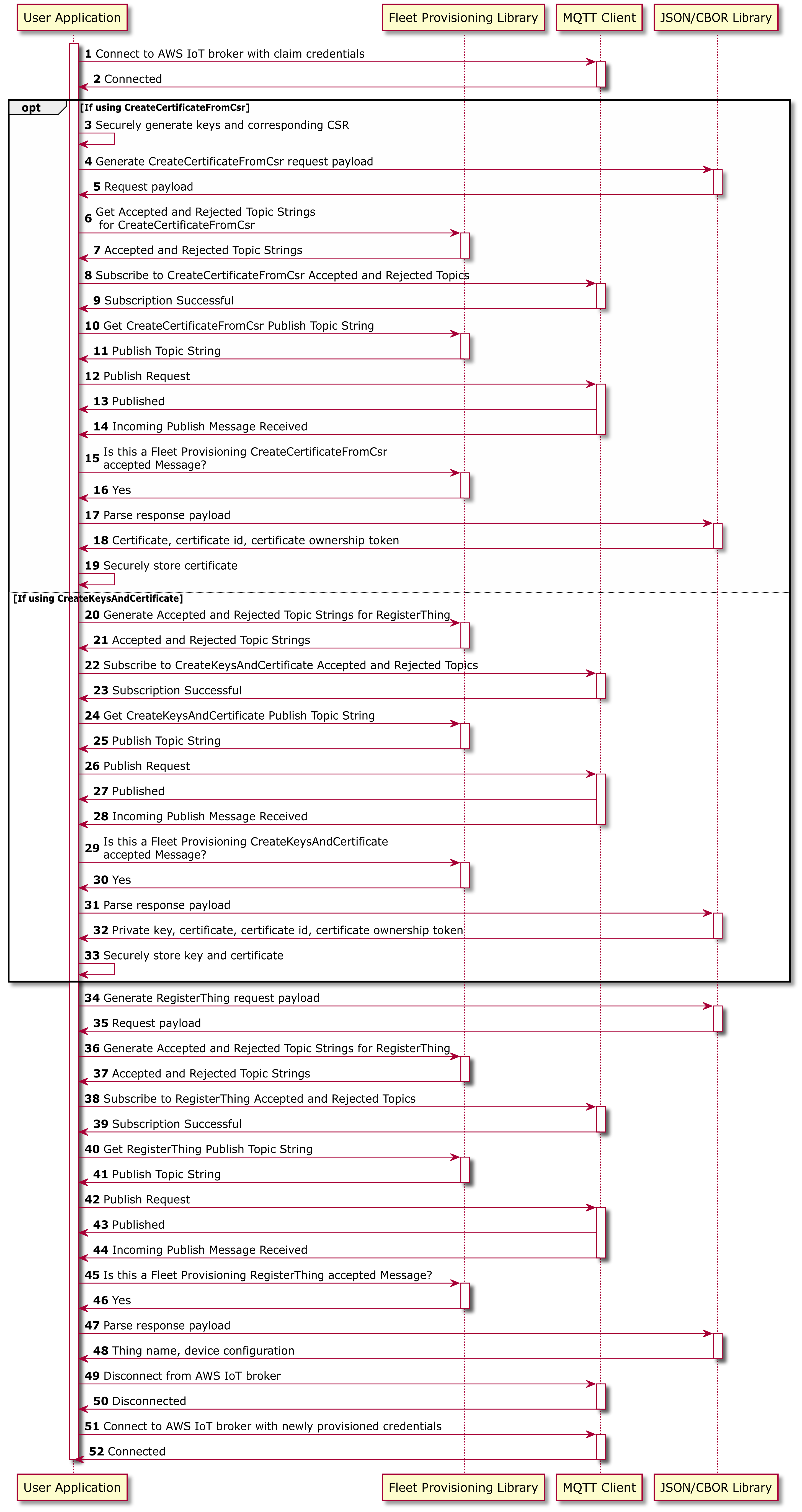 The diagram below demonstrates the happy path an application can take to use the Fleet Provisioning library, a MQTT library, and a JSON or CBOR library to interact with the AWS IoT Fleet Provisioning APIs.
